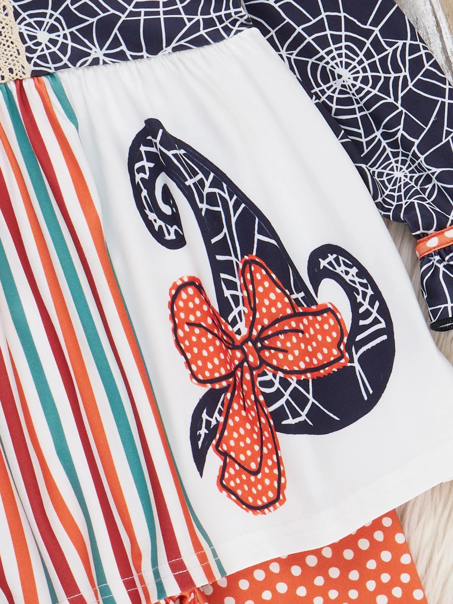 Fun spider web print with ruffle + bow trim